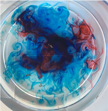 Stage 1, at home edition. For students working online, they were invited to do the same thing with kitchen supplies. Students didn’t find milk or tea to be great tracers, so they used dye, soy sauce and soft drink instead. Introducing different fluid densities added another element of complexity!