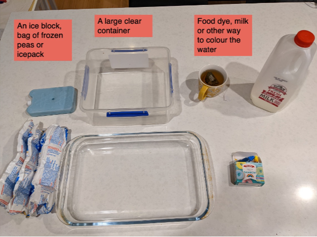 Stage 1, at home edition. For students working online, they were invited to do the same thing with kitchen supplies. Students didn’t find milk or tea to be great tracers, so they used dye, soy sauce and soft drink instead. Introducing different fluid densities added another element of complexity!