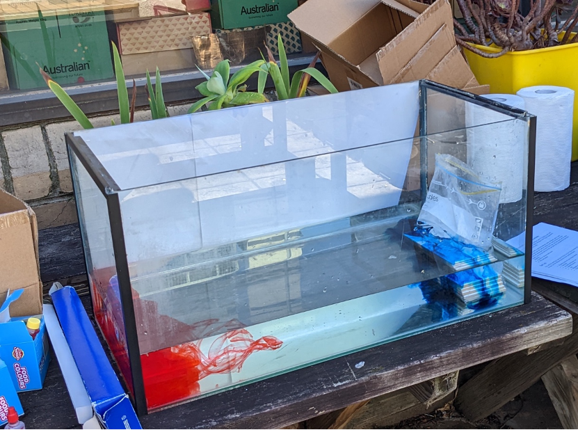 Finally, we added a temperature gradient, by placing ice in the middle of the tanks. This was a real kitchen science experiment, with tea leaves and old jam jars acting as crucial equipment!