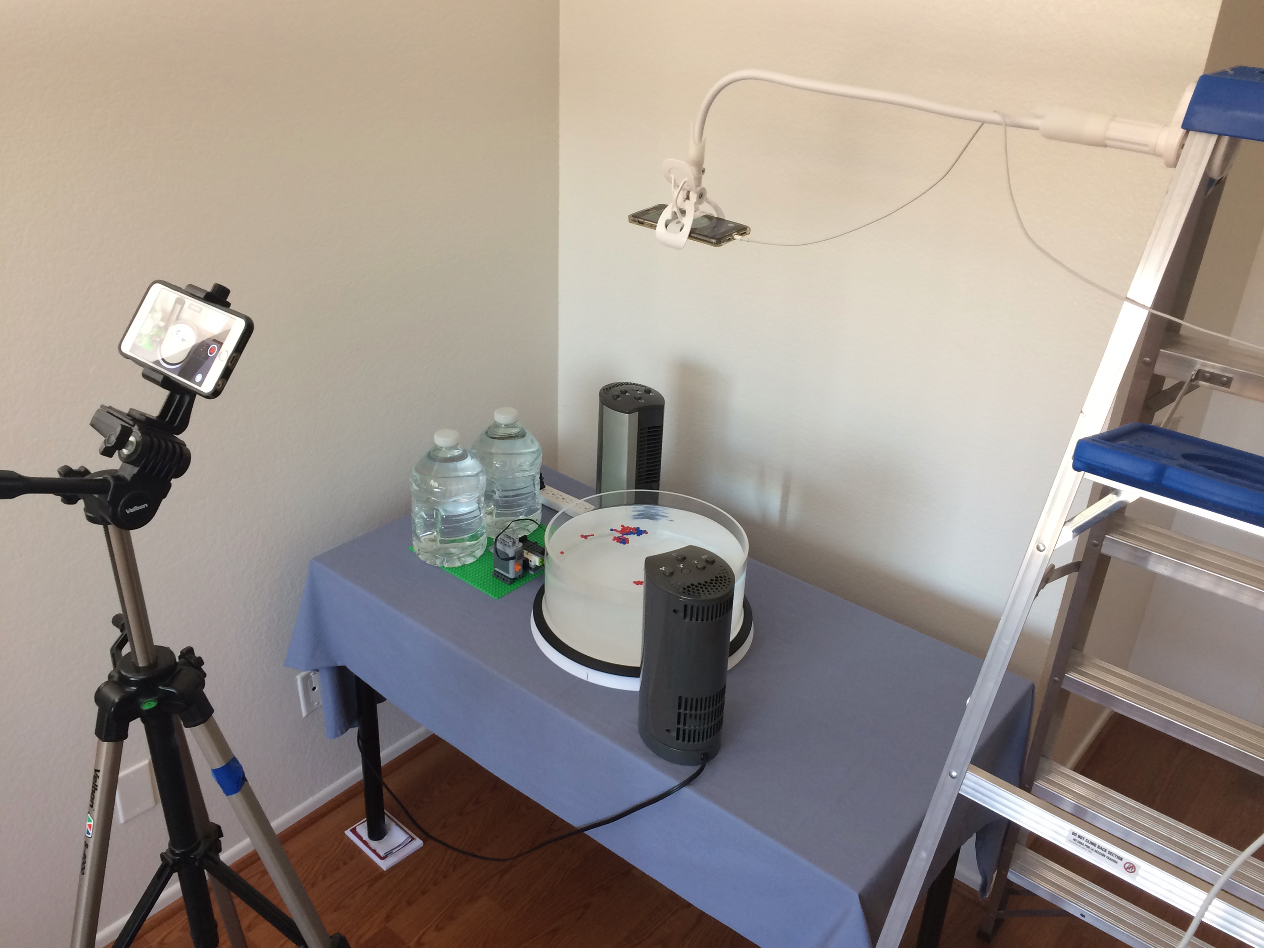 Smartphones are convenient and effective for capturing footage of experiments! Your filming setup will depend on your objectives but more often than not, required equipment can either be found in your household or purchased affordably. The gooseneck camera clamp (pictured supporting the smartphone above the tank) is very useful — its flexibility enables framing the right shot whilst staying out of way of experiments.