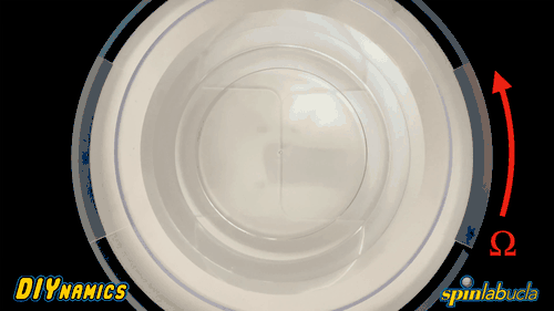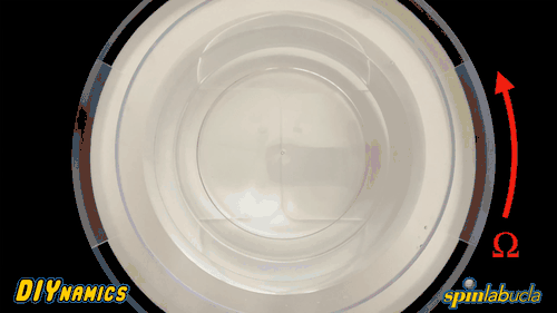 Water with (L) and without (R) surfactant added. Surfactant breaks the water’s surface tension by reducing attraction between its molecules. Notice how food coloring dropped into the water with surfactant remains tight — the food coloring is free to move through the water’s surface. Meanwhile, when food coloring is dropped into the water without surfactant, it disperses — the food coloring encounters resistance at the water’s surface and spreads out before moving through. Note that Ω indicates the rotation direction.