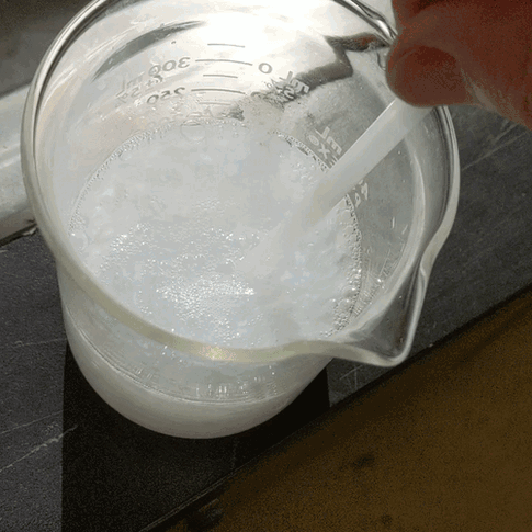 An unwanted byproduct formed when making Barbasoloscope is an oily and bubbly film (see above) that floats atop the rheoscopic fluid and obscures fluid motions beneath. Note that the video tutorial above omits steps for removing the film. Use paper towels to skim off the film. This step must be performed not only after the initial preparation but also after pouring Barbasoloscope into a tank for experiments — the pouring agitates the solutions creating bubbles.