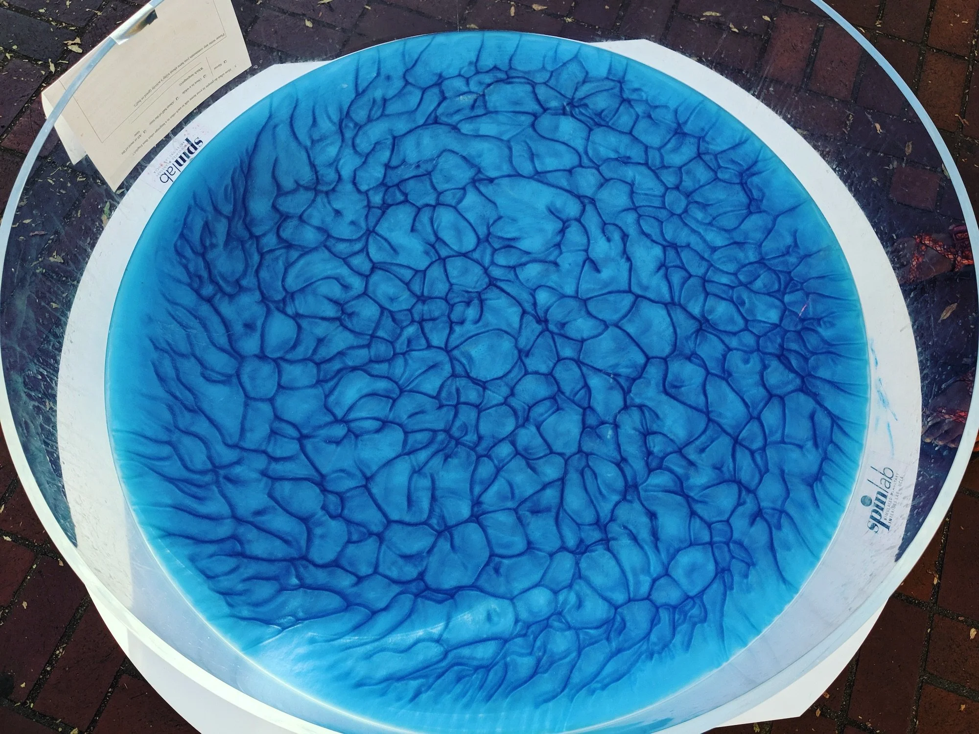 (L) Stirring Barbasoloscope. The rheoscopic fluid is produced by mixing water and shaving cream. Stearic acid crystals in suspension mark fluid flows. Notice the bubbles at the surface — an oily film rises atop the solution after agitation. Utilize a paper towel to skim off the oily and bubbly layer. (R) Non-rotating convection experiment with Barbasoloscope. Cells of overturning hot and cold water can be observed in stunning detail. Barbasoloscope provides both a complete yet incomplete perspective in different respects — all fluid motions are visible only for a 2D view of the surface. Here is a video of Barbasoloscope in action!