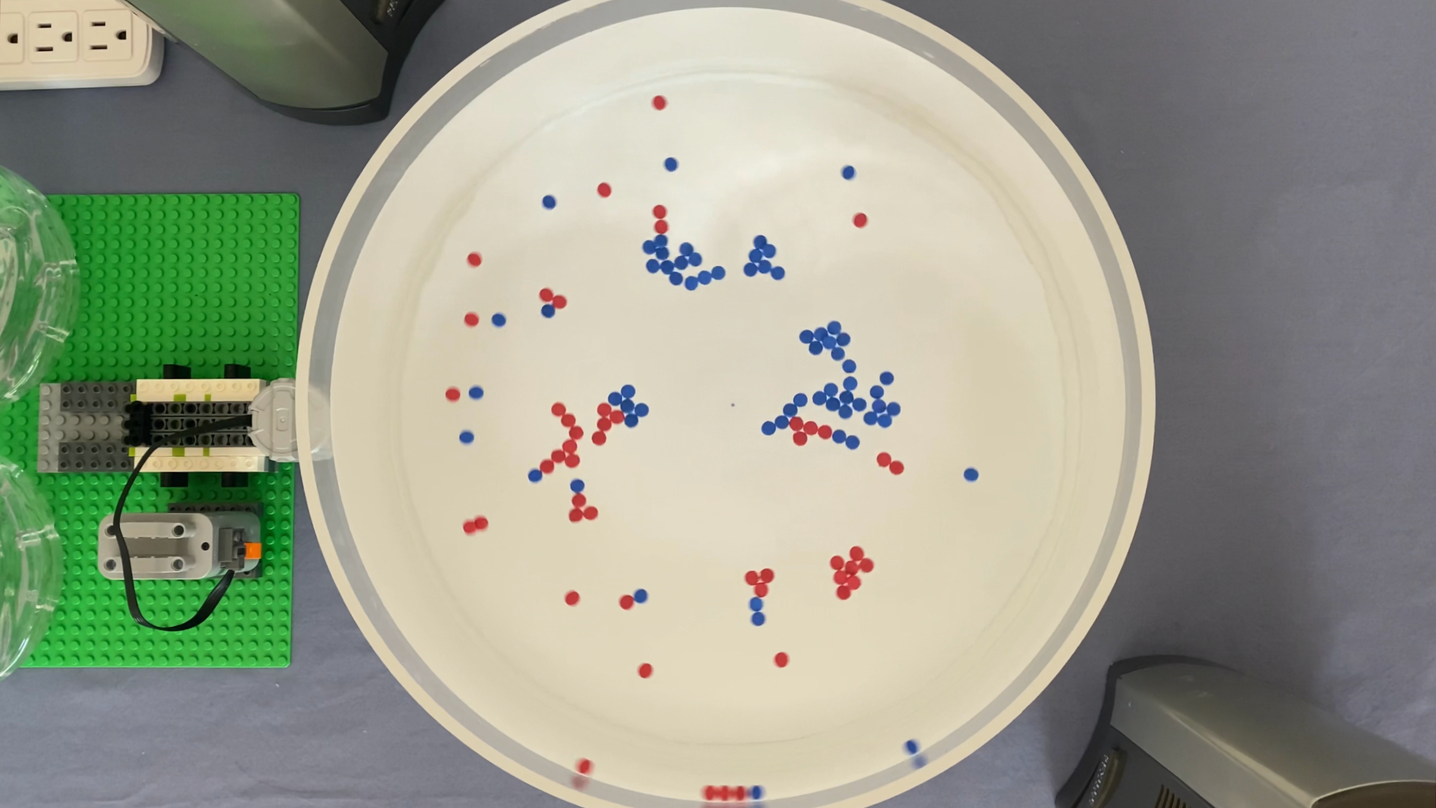 (L) Hole punches of foam sheets serve as excellent floating particles. The foam dots summarize fluid flows at the surface of a fluid layer. (R) Great Pacific garback patch experiment with foam dots. The hole punches of foam sheets represent plastic waste floating in the Pacific Ocean. Air blown from fans in the model represent currents in the real world that gather debris into large groups with significant detrimental effects for the biosphere. Here is a video of particles in action!